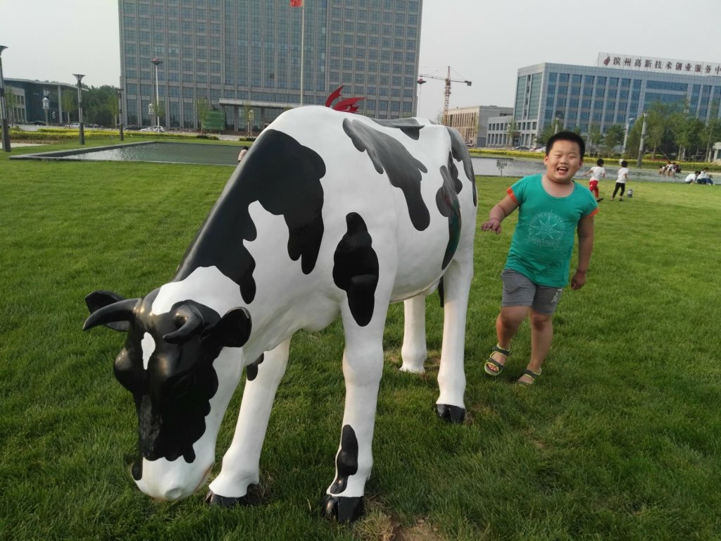 雕塑說(shuō)明:奶牛雕塑共5個(gè),全部玻璃鋼材質(zhì)。本雕塑由我公司自主設(shè)計(jì),五個(gè)奶牛雕塑形態(tài)各異,相互照應(yīng),可以說(shuō)成是一組奶牛群雕。雕塑全部采用寫(xiě)實(shí)風(fēng)格,表面手工彩繪,形象逼真、造型準(zhǔn)確,神態(tài)寧?kù)o、祥和、自如。安裝于山東省濱州市高新區(qū)政府前廣場(chǎng)。