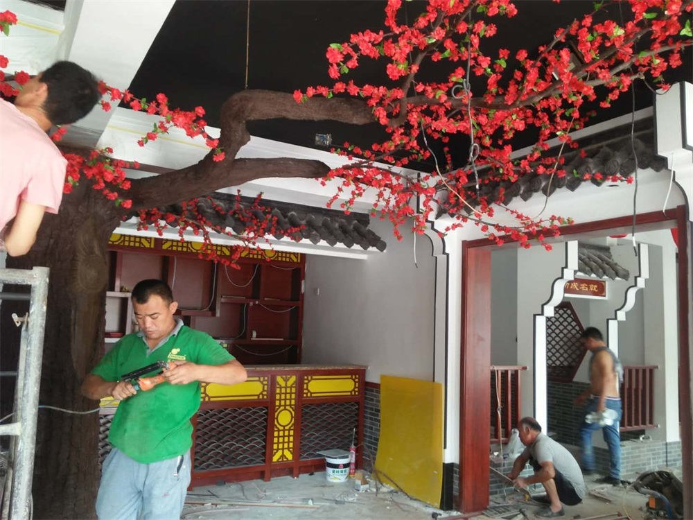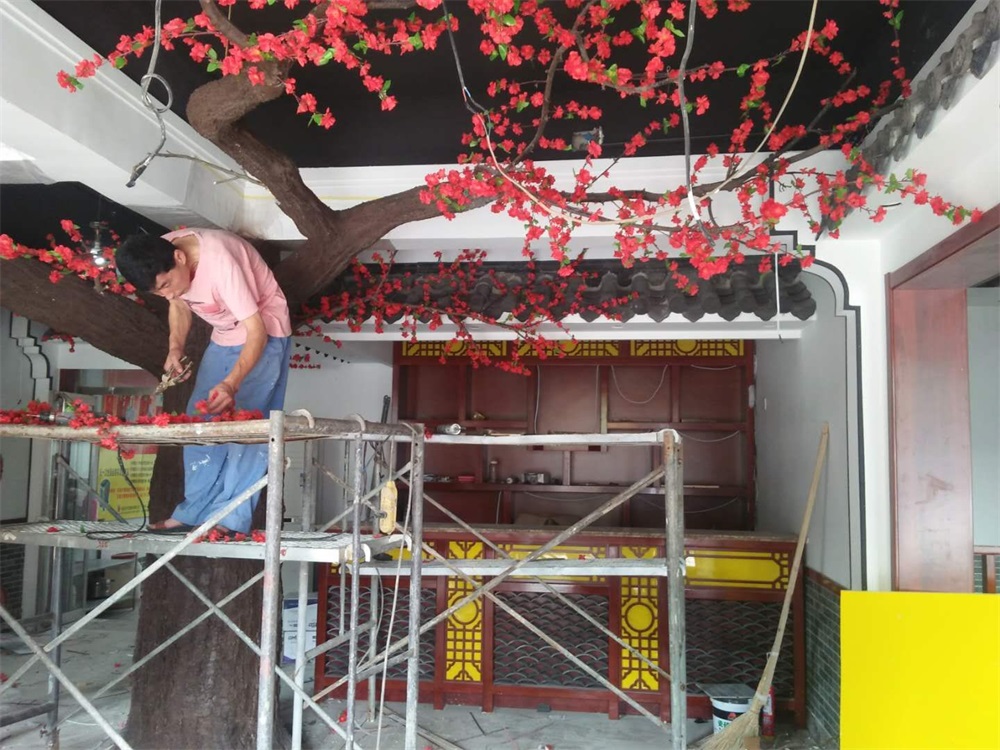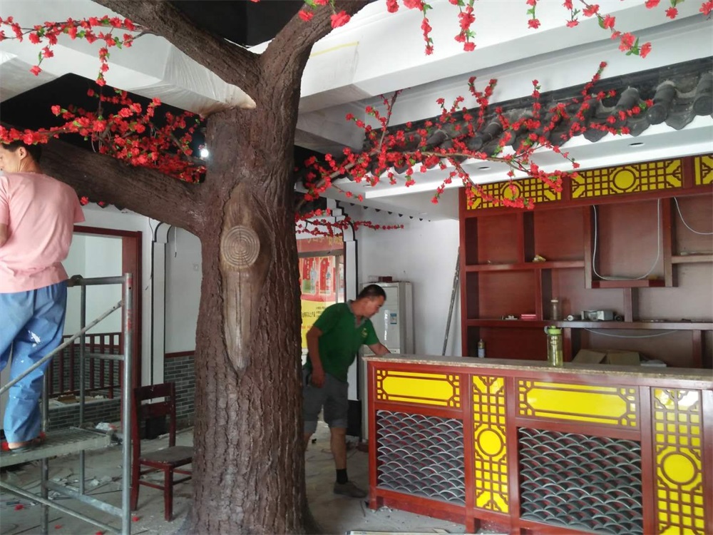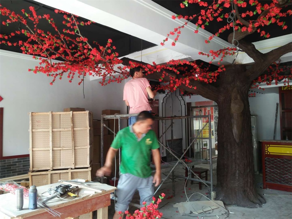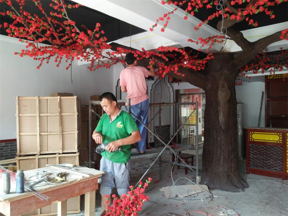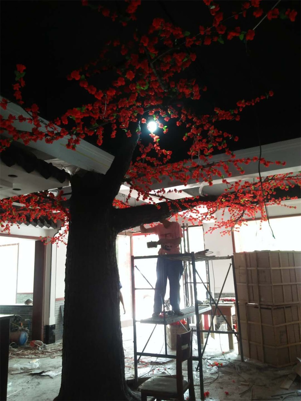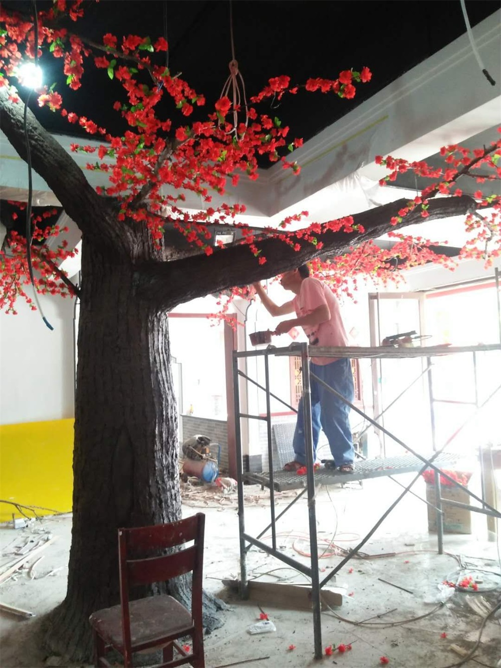項目說明:假樹的樹干及主要枝干采用水泥直塑成型,樹葉和花采用絹布仿真花葉工藝。整體高度3米,樹冠直徑4.5米。