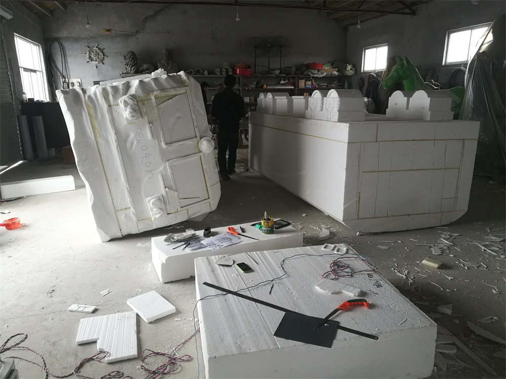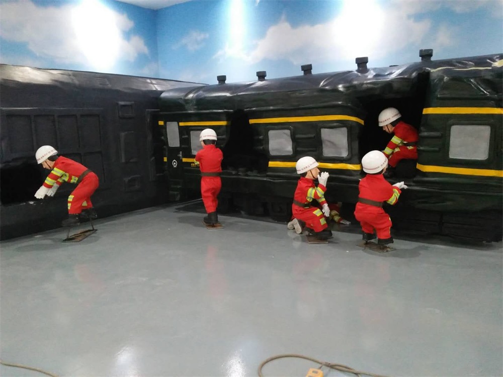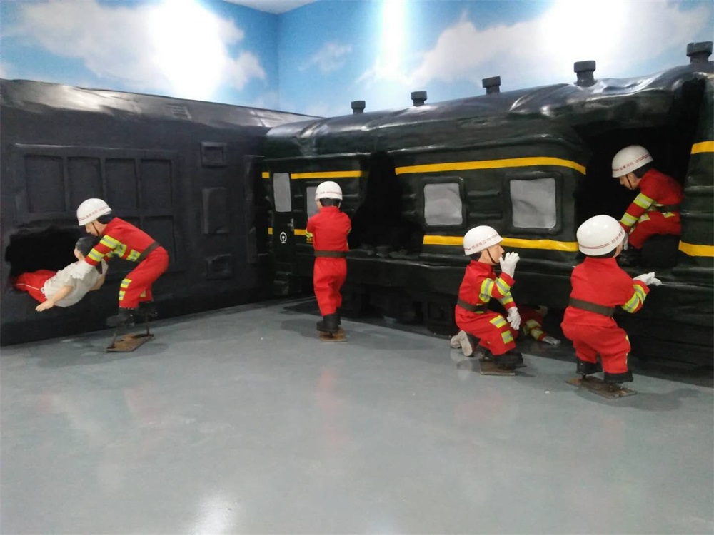 雕塑說明:雕塑整體場景以發(fā)生在淄博市境內(nèi)的一場火車碰撞事故救援現(xiàn)場為題材?;疖嚹P筒捎门菽袼芄に囍谱?,表面彩繪。消防人物雕塑采用玻璃鋼雕塑工藝制作。