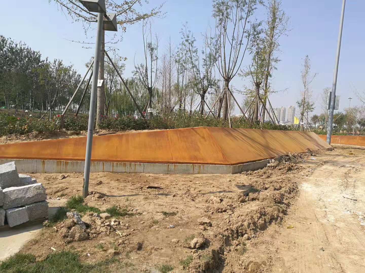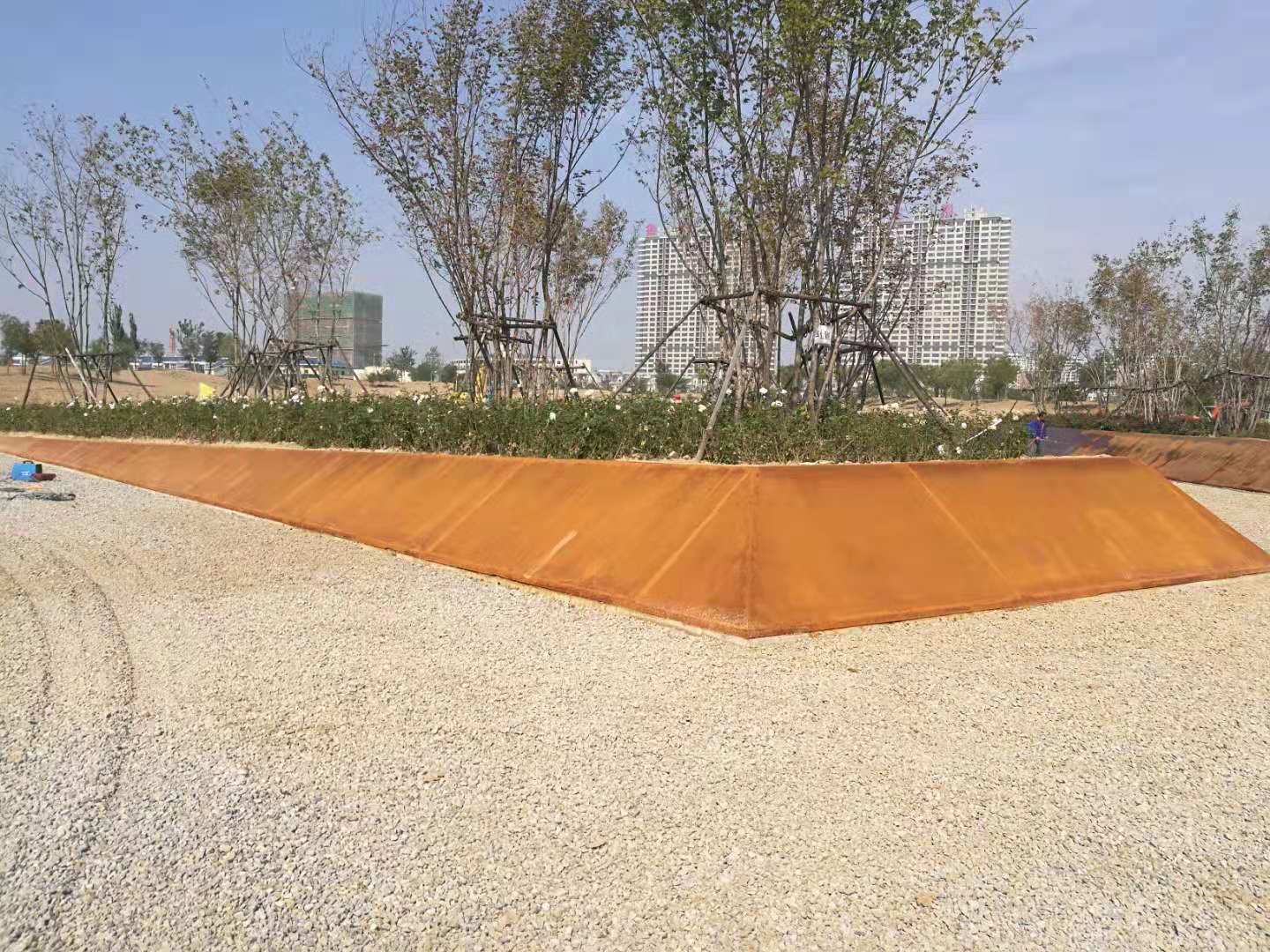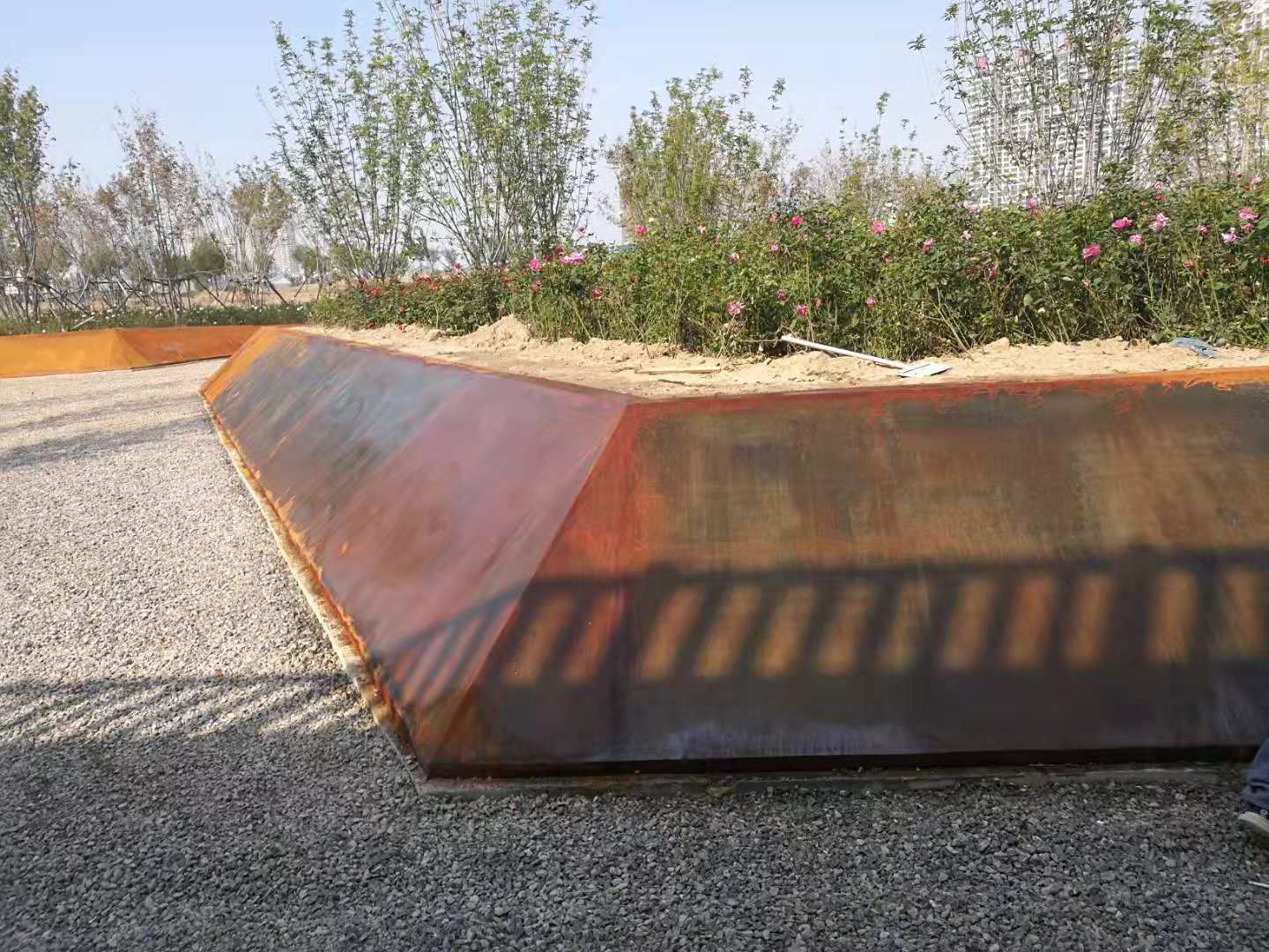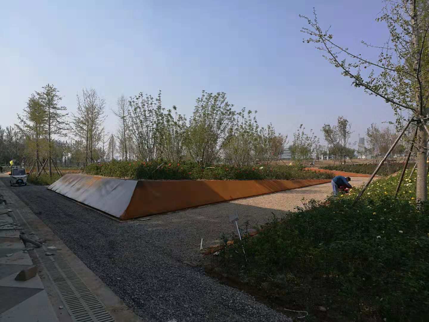 中海植物園即原來的中海景區(qū)東北角的原高爾夫球場區(qū)域,2018年改造升級為濱州中海植物園。所施工的銹板花池共7組,造型表面積共488平方米。造型板采用5mm厚銹板,支撐采用80mm*50mm*2.5mm的U形鋼。采用專業(yè)的耐候鋼生銹劑及固銹劑做表面處理。生銹的初期會呈黃色,然后隨著生銹進程的推移,逐漸顯現金黃色,橙黃色,橙色,橙紅,紅褐色最后在紅褐,或者褐色穩(wěn)定下來。