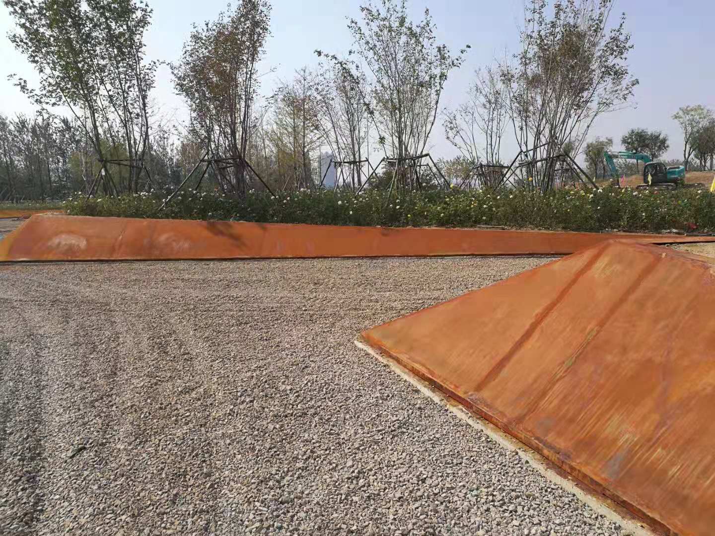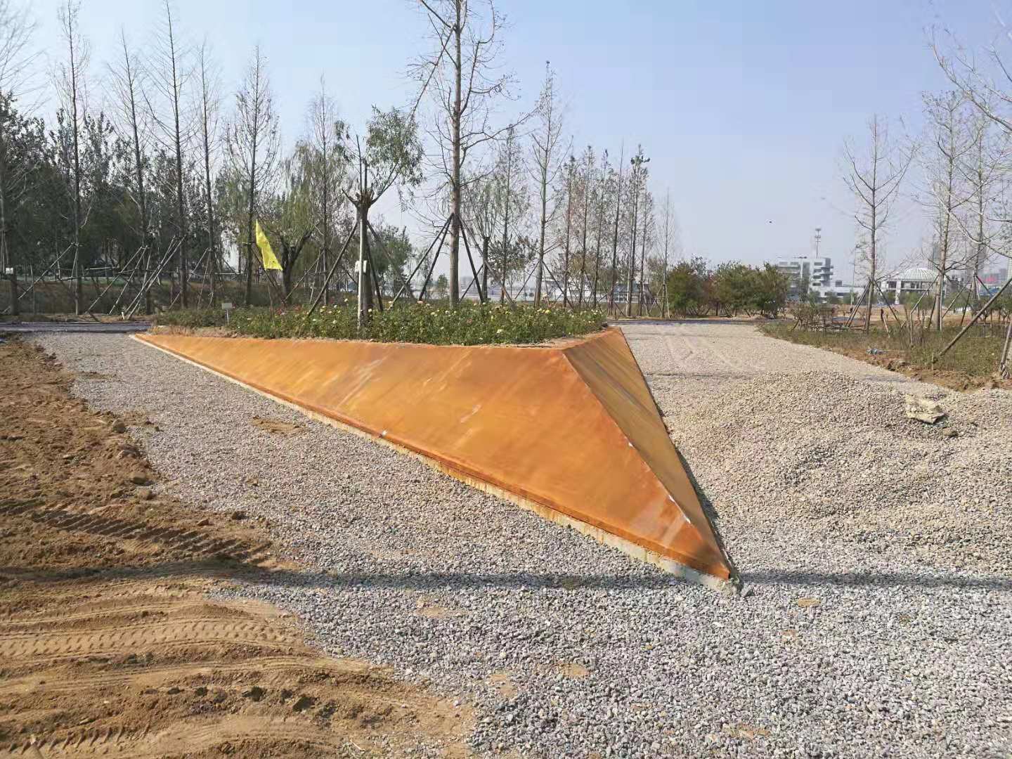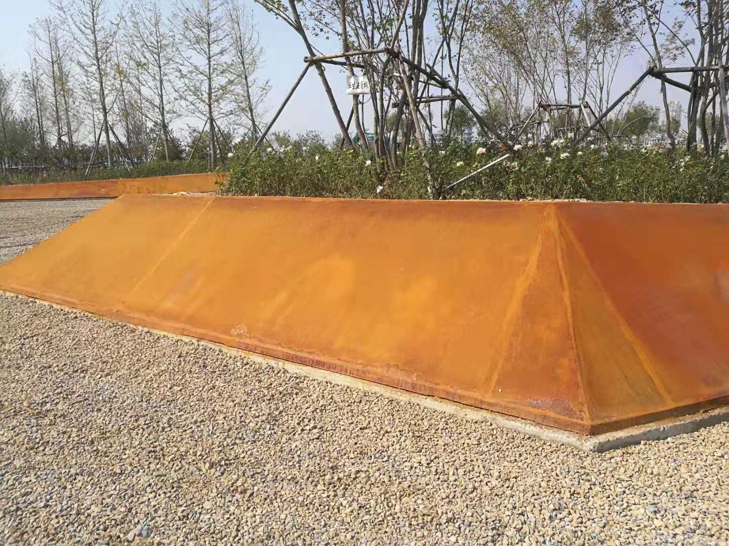 中海植物園即原來的中海景區(qū)東北角的原高爾夫球場區(qū)域,2018年改造升級為濱州中海植物園。所施工的銹板花池共7組,造型表面積共488平方米。造型板采用5mm厚銹板,支撐采用80mm*50mm*2.5mm的U形鋼。采用專業(yè)的耐候鋼生銹劑及固銹劑做表面處理。生銹的初期會呈黃色,然后隨著生銹進程的推移,逐漸顯現金黃色,橙黃色,橙色,橙紅,紅褐色最后在紅褐,或者褐色穩(wěn)定下來。