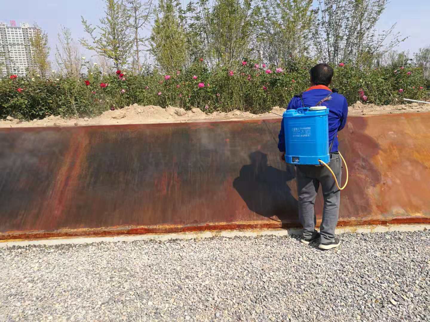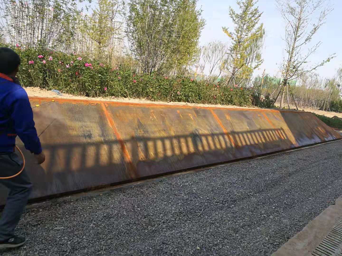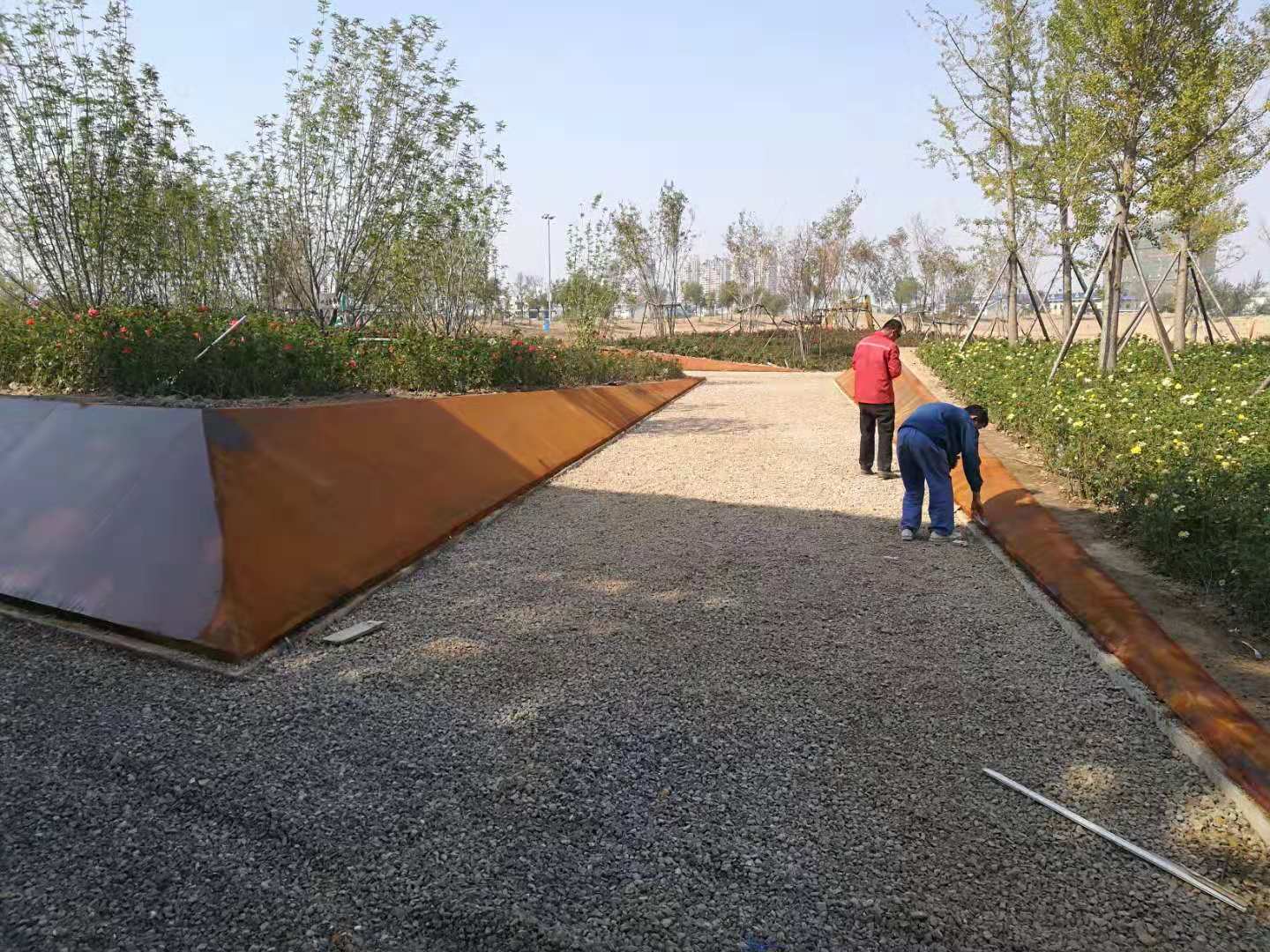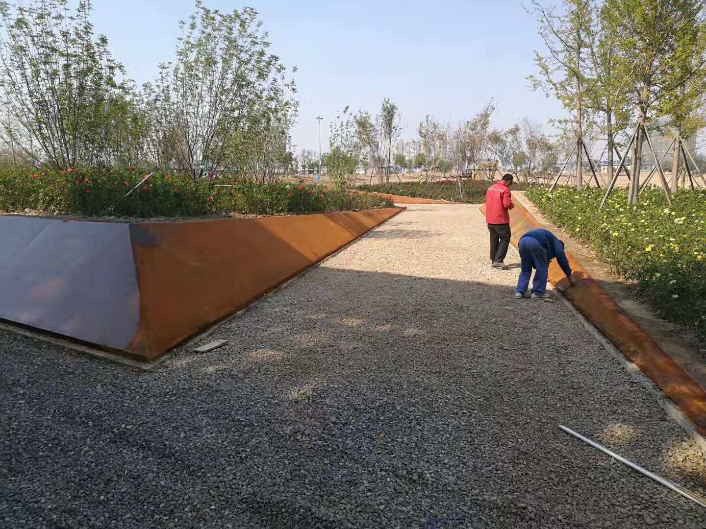 中海植物園即原來的中海景區(qū)東北角的原高爾夫球場區(qū)域,2018年改造升級為濱州中海植物園。所施工的銹板花池共7組,造型表面積共488平方米。造型板采用5mm厚銹板,支撐采用80mm*50mm*2.5mm的U形鋼。采用專業(yè)的耐候鋼生銹劑及固銹劑做表面處理。生銹的初期會呈黃色,然后隨著生銹進程的推移,逐漸顯現金黃色,橙黃色,橙色,橙紅,紅褐色最后在紅褐,或者褐色穩(wěn)定下來。